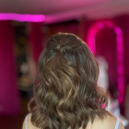 Елегантна зачіска, де частина волосся зібрана, а частина залишається розпущеною. Ідеально підходить для святкових заходів, побачень або фотосесій, створюючи ніжний і романтичний образ.